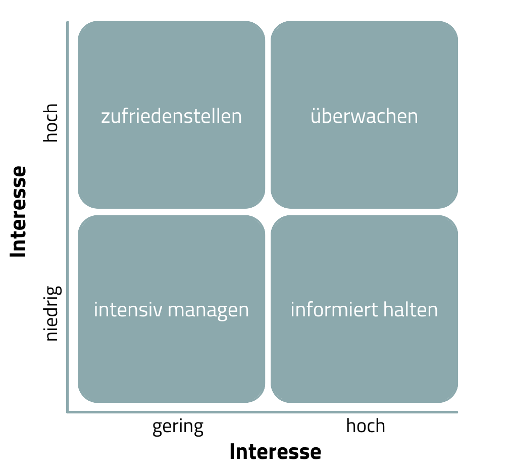- und bei hohem Einfluss und hohem Interesse müssen Stakeholder intensiv gemanagt bzw. eng eingebunden werden. Diese Einordnung hilft, die begrenzten Kommunikationsressourcen zielgerichtet einzusetzen.