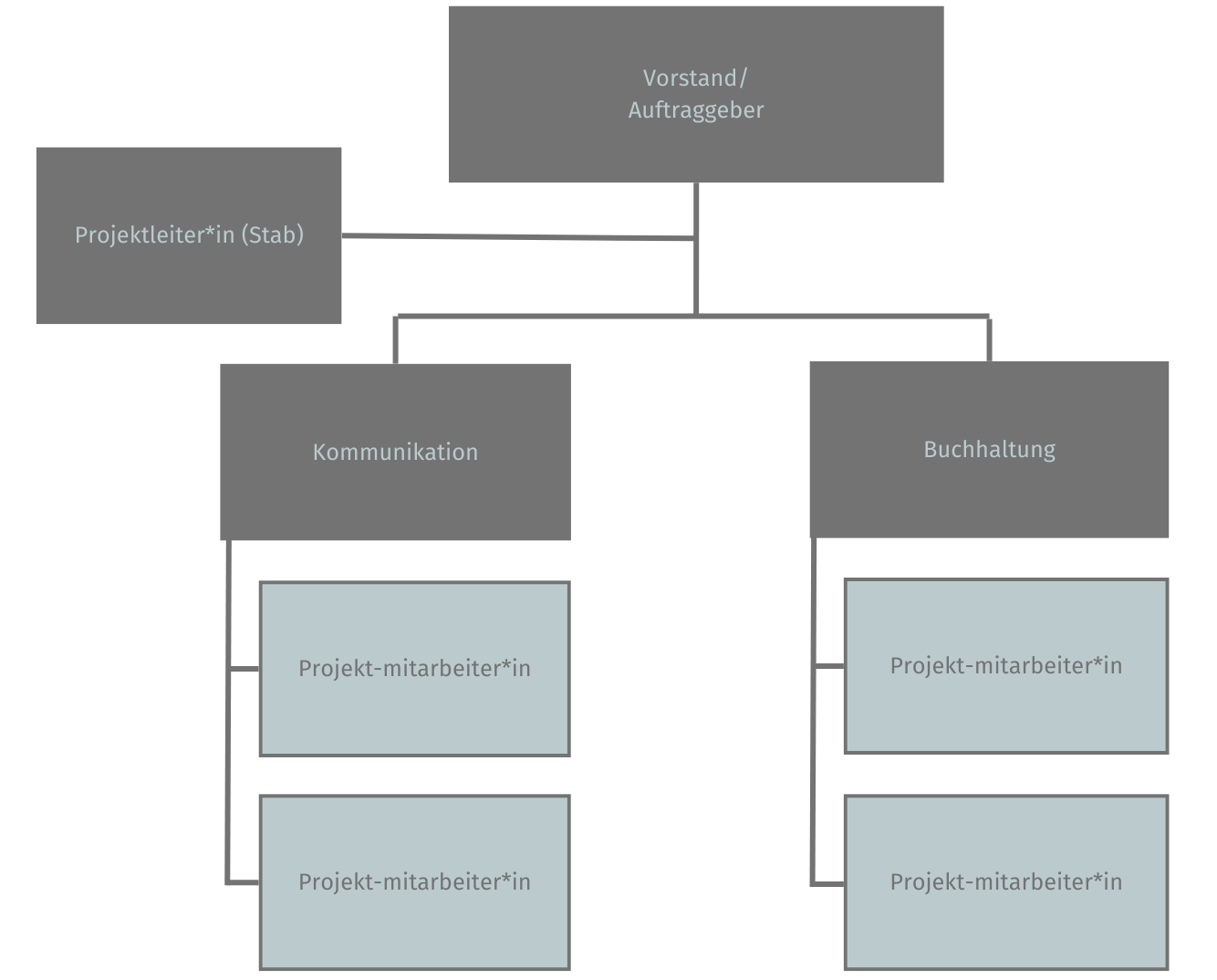 Matrix-Projektorganisation: Ein Matrixmodell verbindet Linie und Projekt. Die Mitarbeitenden bleiben in ihren Fachabteilungen, arbeiten aber teilweise im Projekt mit. Es gibt sowohl eine Projektleitung als auch die normalen Vorgesetzten in der Linie. Die Mitarbeitenden haben also zwei Berichtslinien. Praktisch läuft es so: Die Projektleitung plant die Aufgaben und bittet die betreffenden Mitarbeiter um Umsetzung; diese müssen die Verfügbarkeit mit ihren Abteilungen abstimmen. Die Abteilungsleitungen stellen die erforderlichen Kapazitäten bereit und haben ein Auge darauf, dass weder die Projektarbeit noch das Tagesgeschäft zu kurz kommt. Matrixorganisationen erfordern Abstimmung auf allen Ebenen, bieten aber den Vorteil, dass Expert*innen aus verschiedenen Bereichen zusammenkommen, ohne komplett aus ihrer Stammorganisation herausgelöst zu sein.