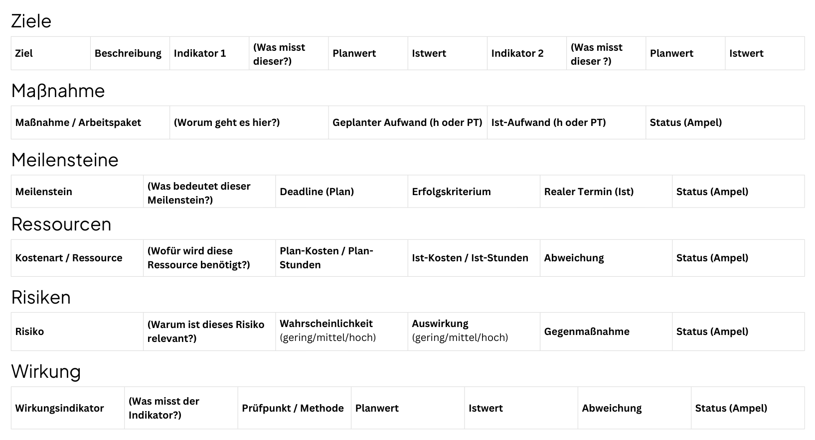 - Kostenziel – Mit welchem Aufwand (Budget, Personal, Ressourcen) soll das Ziel erreicht werden?