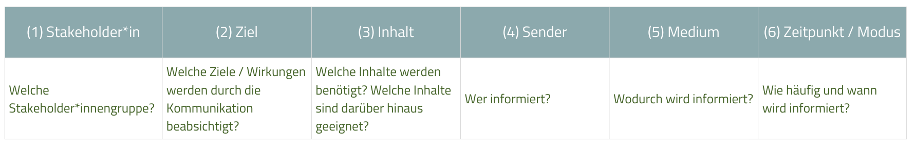 - Kommunikation passend wählen: Nicht jedes Stakeholder-Segment braucht dieselbe Informationsform oder -tiefe.