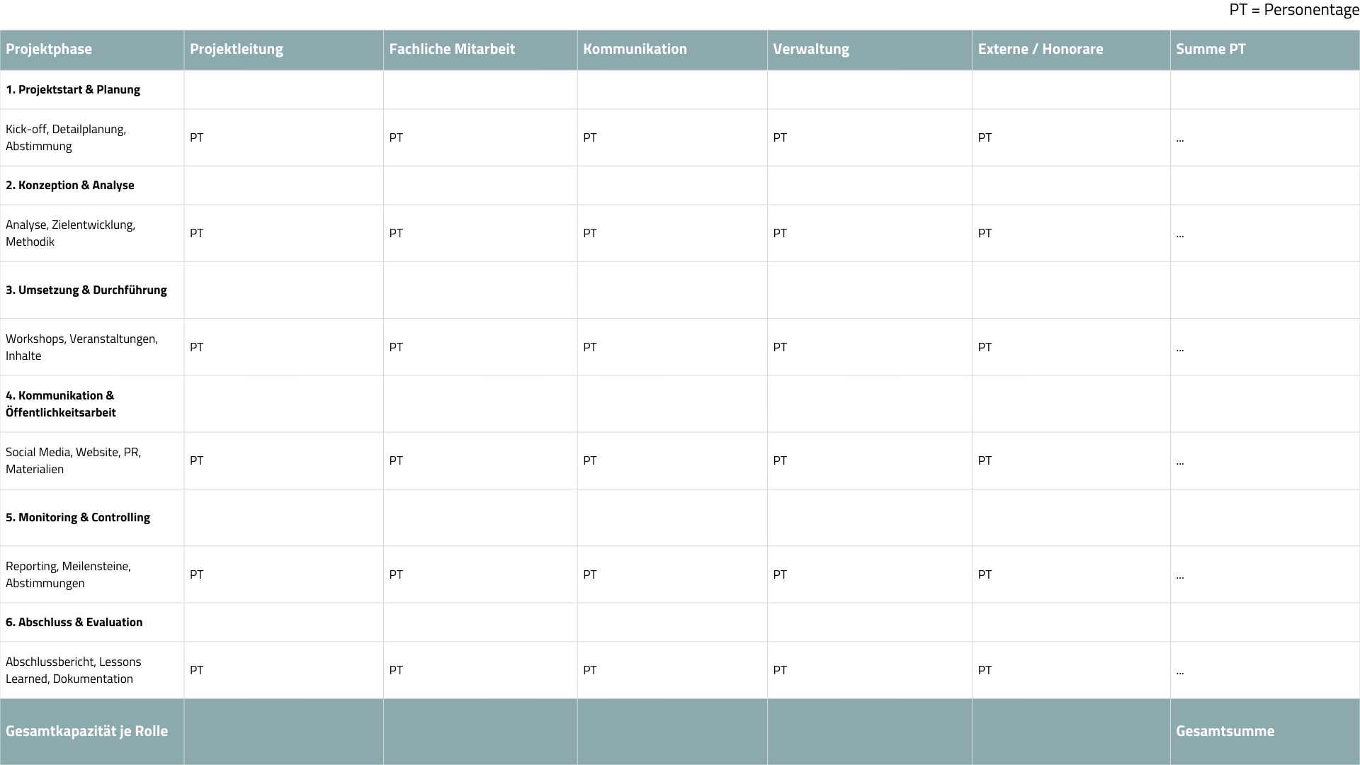 Kapazitätsplanung: Neben Geld ist Zeit die andere kritische Ressource. Deshalb sollte eine Planung erstellt werden, welche personellen Kapazitäten benötigt sind, also wie viele Stunden/Personentage welches Teammitglied für das Projekt aufwenden kann oder muss. Ein Kapazitätsplan stellt z. B. tabellarisch die Projektphasen den beteiligten Rollen gegenüber. So könnte man festhalten, dass in der Planungsphase die Projektleitung z. B. 10 Tage benötigt, die Fachreferenten 5 Tage und die Öffentlichkeitsarbeit 2 Tage, etc. Im gezeigten Beispiel wurde eine Tabelle verwendet, in der für jede Phase (Projektstart & Planung, Konzeption/Analyse, Umsetzung, Kommunikation & Öffentlichkeitsarbeit, Monitoring & Controlling, Abschluss) angegeben war, wie viele Stunden jede Rolle einbringt. Dies gibt einerseits Aufschluss darüber, ob das vorhandene Personal ausreicht oder Engpässe drohen, andererseits hilft es bei der Abstimmung mit Abteilungen (im Matrixfall) und bei der Terminplanung. Die Kapazitätsplanung sollte realistisch sein und Puffer für Unvorhergesehenes enthalten. Gerade in NGOs, wo Teammitglieder oft parallel noch andere Aufgaben haben, ist es wichtig, den Aufwand nicht zu knapp zu kalkulieren. Im Zweifel lieber etwas mehr Zeit einplanen, als dass das Team dauerhaft überlastet wird.