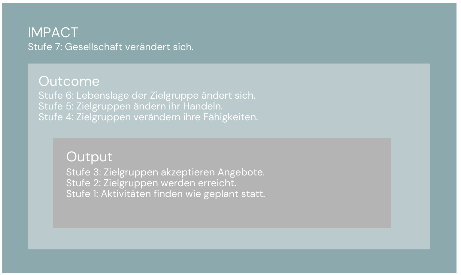 - Impact meint die übergeordnete gesellschaftliche Wirkung, also langfristige Veränderungen auf Gesellschafts- oder Systemebene.