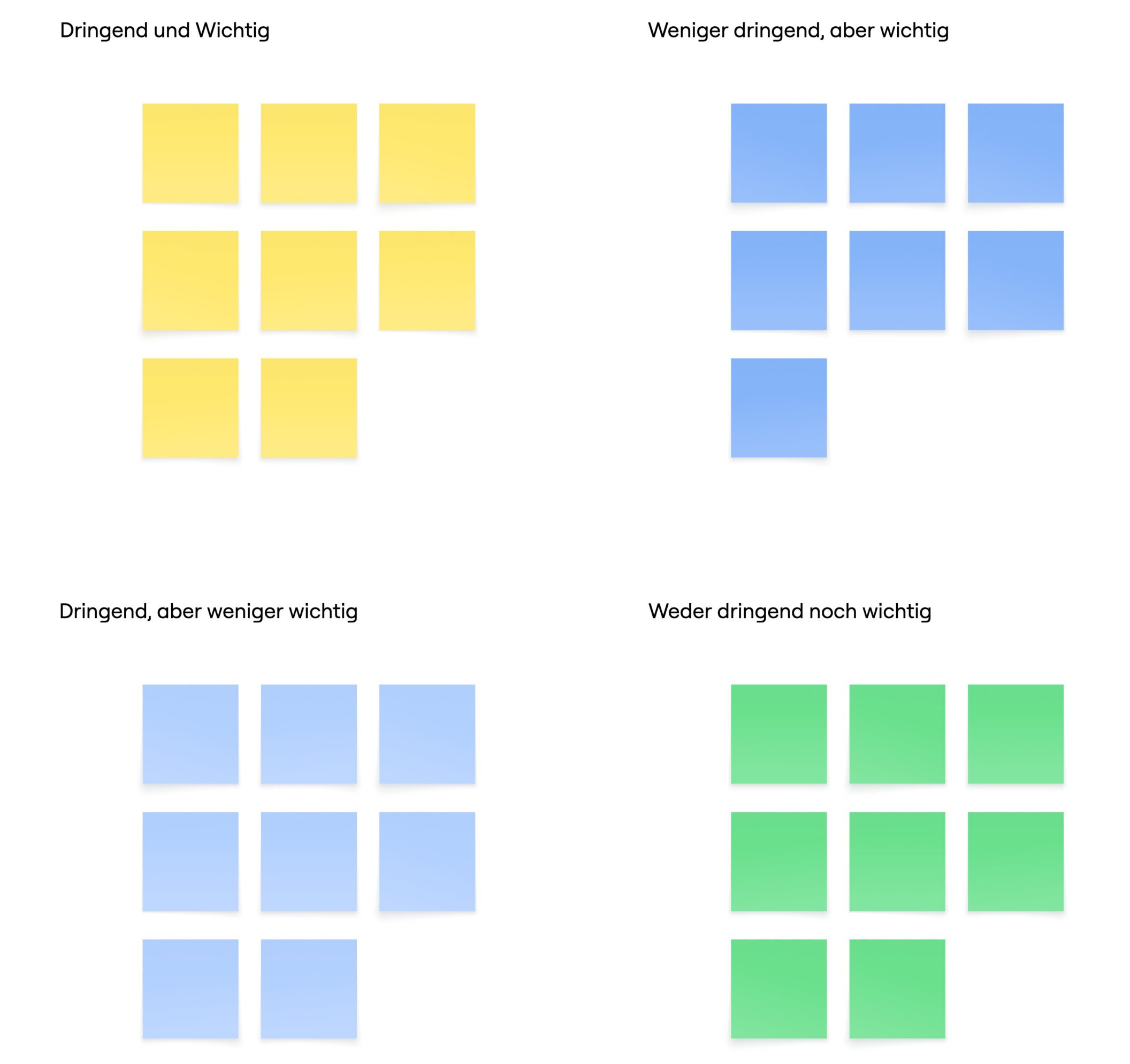 - Don’t do (weder wichtig noch dringend): Eliminieren oder ignorieren – solche Aufgaben binden Zeit, ohne einen Beitrag zu den Projektzielen zu leisten.