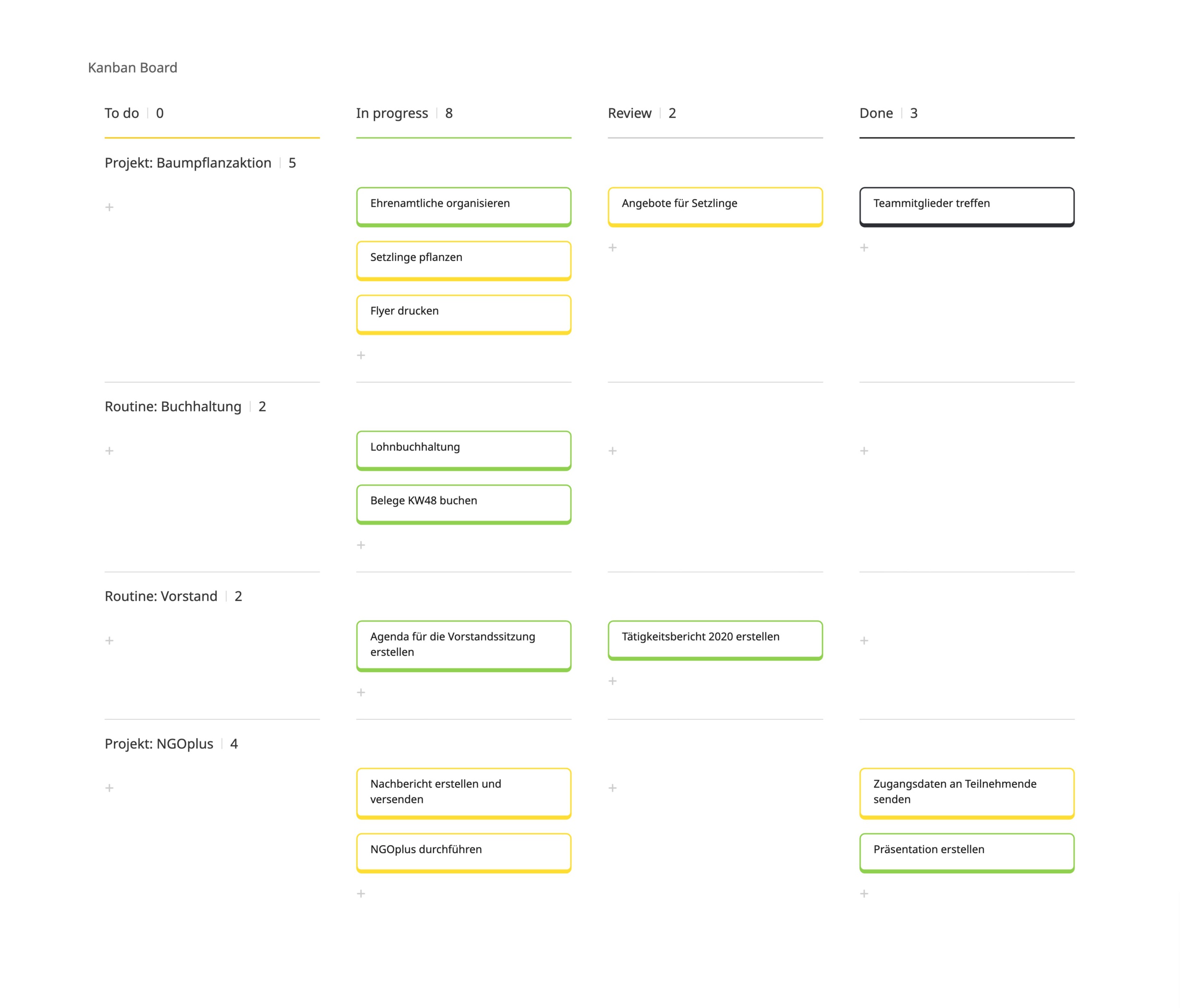 - Kanban-Board: Ein Kanban-Board stammt ursprünglich aus agilen Methoden, lässt sich aber auch im klassischen Projekt nutzen. Es ist ein Board zur Visualisierung von Aufgaben und ihrem Status (z. B. Spalten „Offen – In Bearbeitung – Erledigt“), oft ergänzt um wenige Kennzahlen. Mit Haftnotizen oder digitalen Tools wie Trello, Jira, Miro oder Asana können Aufgaben verschoben und aktualisiert werden. So sieht das Team jederzeit den Arbeitsstand. Besonders in kleineren NGO-Teams kann ein Kanban-Board ein einfaches und wirkungsvolles Mittel sein, um Arbeit transparent zu machen und Engpässe zu erkennen.